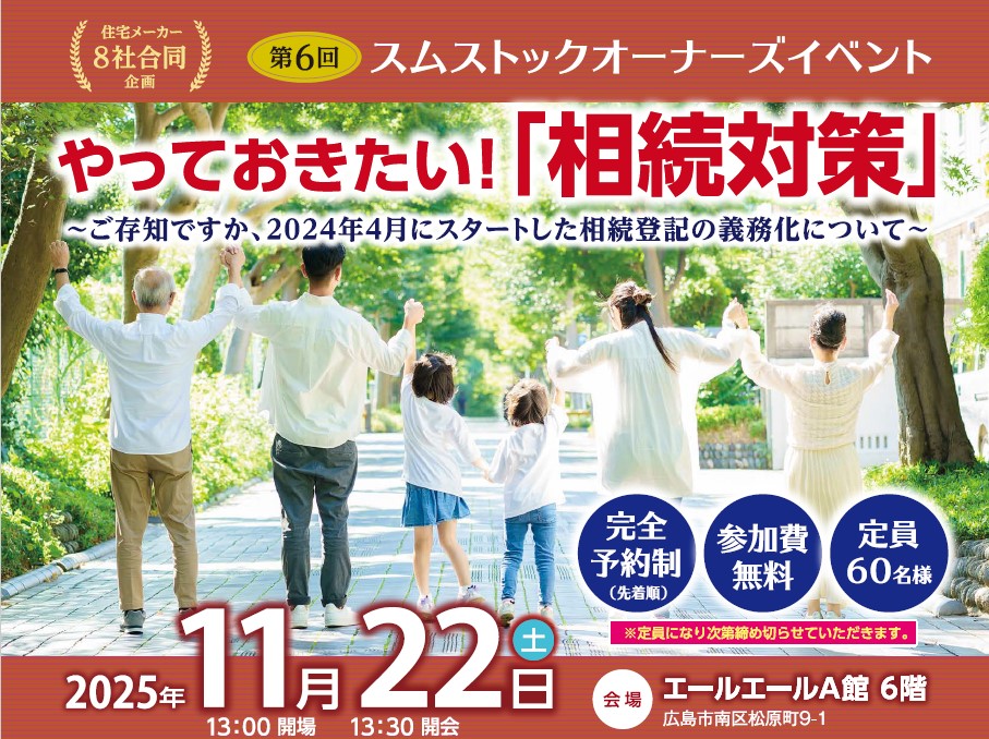 ↑詳細は画像をTAP! ーーーーーーーーーーーーーーーーーーーーーーーーーー 第6回スムストックオーナーズイベント 11/22(土)13:30~ やっておきたい!「相続対策」 会…